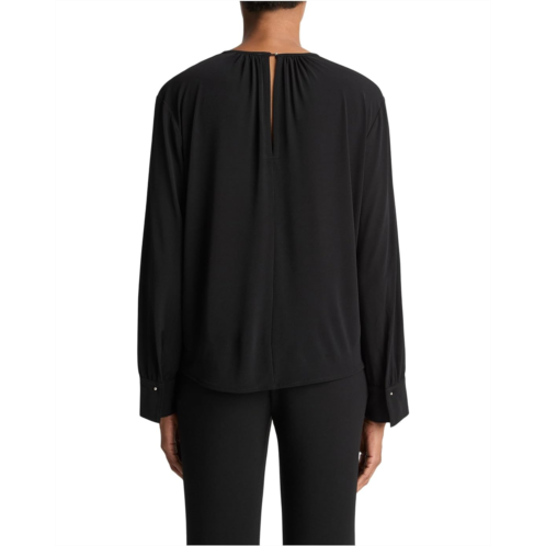 Crafted with a light, drapey finish, gathered neckline, and long sleeves, this elegant Vince Soft Gathered Blouse adds instant polish to skirts, trousers, and denim alike. Designed with a relaxed, slightly oversized silhouette, the blouse features a delicate keyhole on the back, fastened with a subtle button closure for ease and elegance.