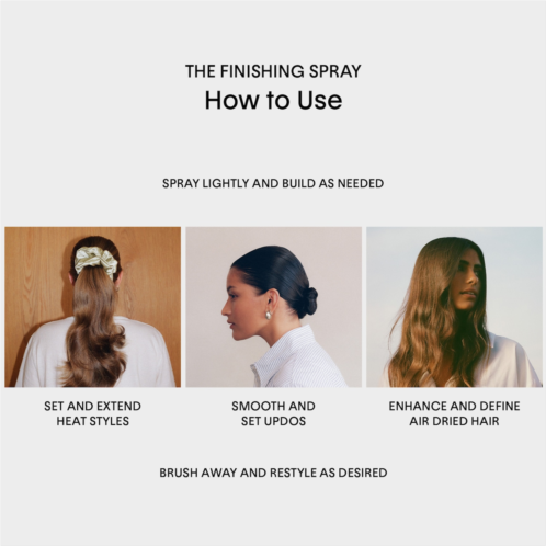 What Else You Need to Know: The Finishing Spray is formulated to set, style, add polish and nourish. Made with our proprietary Tsubaki Meadows oil blend for hydration, and our signature Brush Away Blend for buildable hold that can be easily brushed out without a wash, this innovative hairspray supports everyday styling.