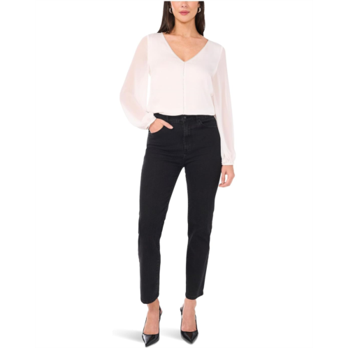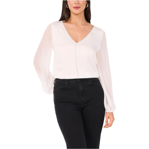 The Vince Camuto V-Neck Chiffon Sleeve Blouse w/ Rhinestone Trim features a V-neckline, long sheer chiffon sleeves, and a pullover design that's both flattering and easy to wear. The standout detail is the rhinestone trim, which adds a touch of shimmer along the neckline.