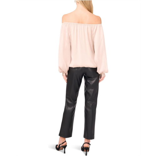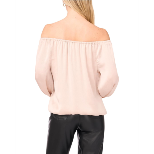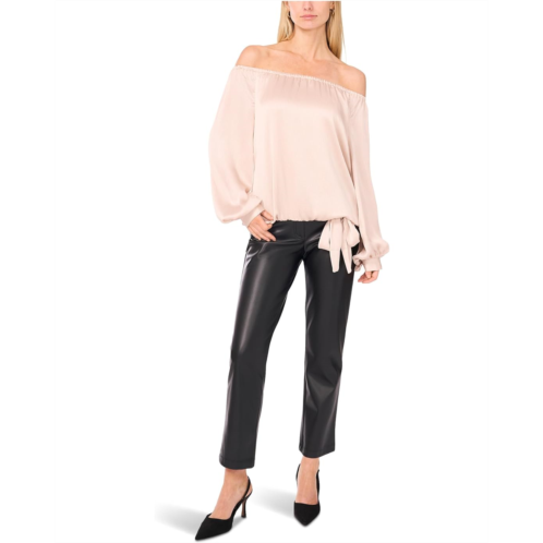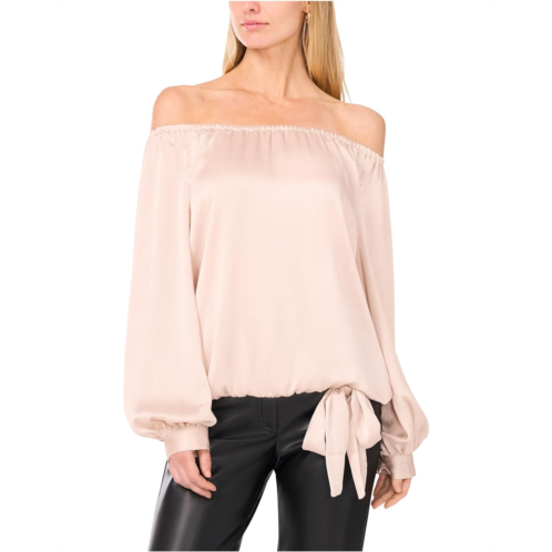 The Vince Camuto Off Shoulder Long Sleeve Blouse W Tie showcases an off-the-shoulder neckline framed by billowing long sleeves that add volume and elegance. The tie-front waist cinches the silhouette for a flattering fit.