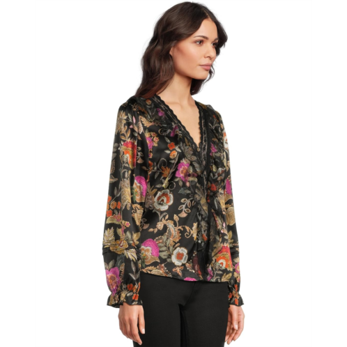 Romantic and refined, the Johnny Was Claudia Blouse - Lowri blouse blooms with vibrant florals across a dark backdrop. Detailed with a scalloped trim along the V-neckline and long billowed sleeves, it brings a touch of elegance to its relaxed-fitting silhouette. Effortlessly versatile, it's perfect for pairing with denim or dressing up for evening outings.