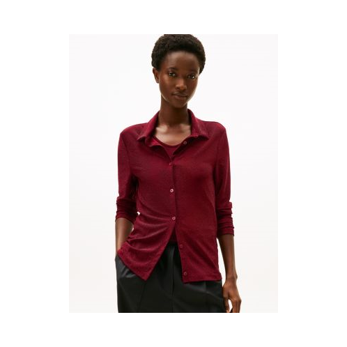 - Button closure, spread collar, metallic shimmer.