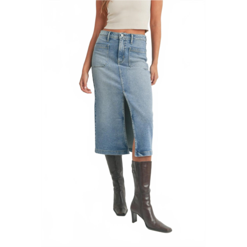 [US] JUST BLACK denim goldie utility pocket midi skirt in medium denim
