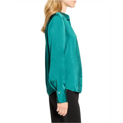 An easy band collar top taken to the next level with anything-but-ordinary construction. Crafted from a luxe Day Gloss fabric, she offers the sophisticated look of silk with a more durable, easy-care design. With a hidden button front and cuff. The weight of the fabric provides a flattering drape, while the breezy woven construction ensures all-day comfort.