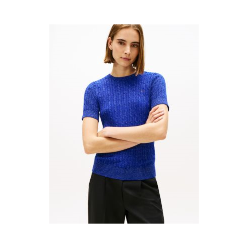 Tommy Hilfiger women's sweater. Made from premium cotton our lightweight cable knit sweater is a soft, comfortable layer. This classic short-sleeve style is made festive with a dash of metallic shimmer.