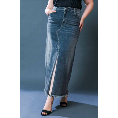 Show off just the right amount of skin in this beautifuly designed midi length skirt.Meet the Fray Denim Skirt by FLYING TOMATO, a must-have addition to your wardrobe for a touch of 90s flair. This stylish blue denim piece is crafted from a cotton blend featuring a high front slit, front button closure, handy side and back pockets, and a chic fray bottom. Designed as a solid-patterned midi skirt, it measures approximately 42 inches in length, perfect for elevating your vacation look. Ideal for summer outings, it's available in plus size with the model wearing a size 1XL (5'9' height).