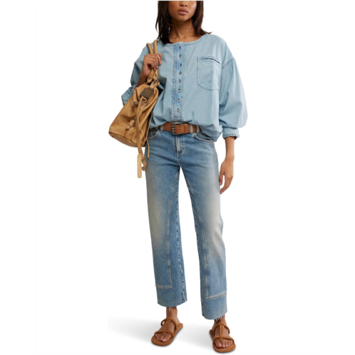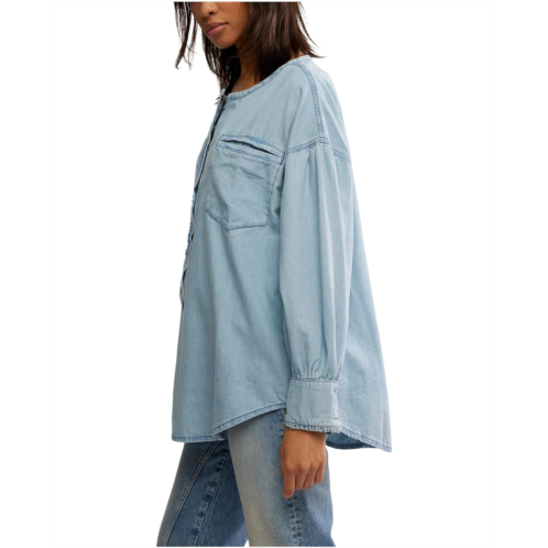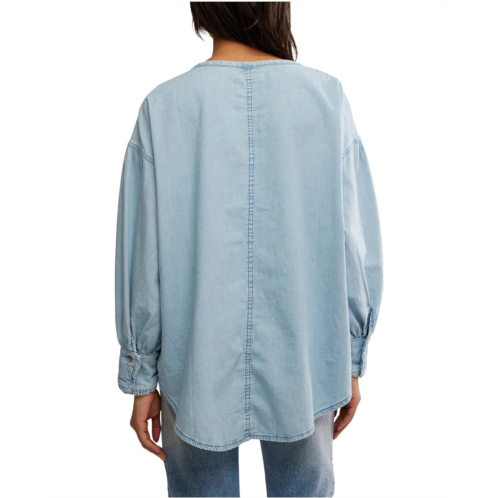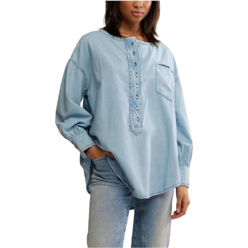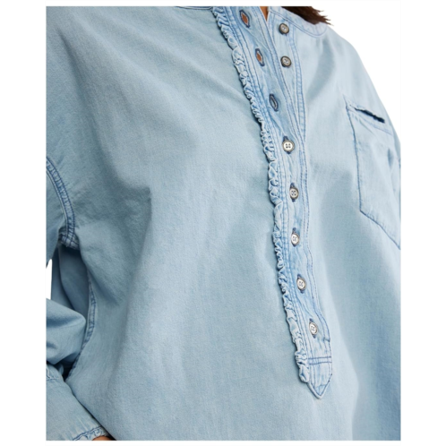 A classic material meets a breezy silhouette with this oversized chambray denim pullover from We The Free, featuring an elongated henley neckline and puffy drop-shoulder sleeves, finished with ruffle-trimmed cuffs for a darling detail. The perfect piece for light layering throughout the year. Featuring chambray denim fabrication, round neckline with elongated henley button closure, chest pocket, puffed drop-shoulder sleeves, button cuffs with subtle ruffle trim, and a rounded hem.