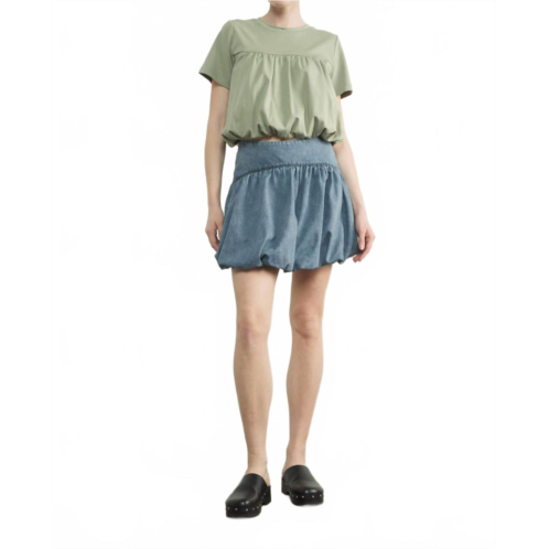 Show just the right amount of leg in this fit flattering mini.Elevate your summer wardrobe with the Aaron & Amber Bubble Denim Mini Skorts in a chic medium wash. These versatile skorts combine the playful allure of a bubble skirt with the practicality of shorts, featuring a mini length and side zipper closure. Crafted from a breathable cotton blend of 75% cotton and 25% polyester, these skorts offer both comfort and style. Care - Machine wash and tumble dry for effortless maintenance, making them perfect for vacation and minimalist seasonal trends.