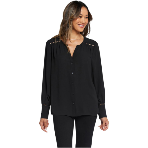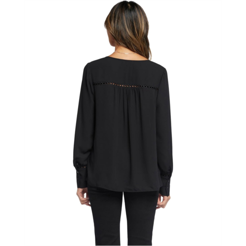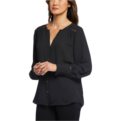 The NYDJ Liliana Lace Peasant top is a charming addition to any wardrobe. With its exquisite lace detailing, this top adds a touch of elegance to any outfit. It features a split V-neckline and buttoned front closure. The front and back gather to create a flattering silhouette, while the voluminous long sleeves with buttoned cuffs add a feminine and classic touch.