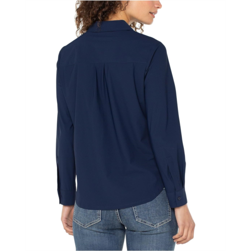 The Liverpool Los Angeles Long Sleeve Collared Zip Front Knit Shirt is a versatile wardrobe essential that effortlessly combines comfort with classic style. Crafted from soft and stretchy knit fabric, this shirt offers a cozy and breathable feel, making it perfect for year-round wear. It has a collared neckline with a quarter-zip placket, long sleeves with buttoned cuffs, and a curved hem.