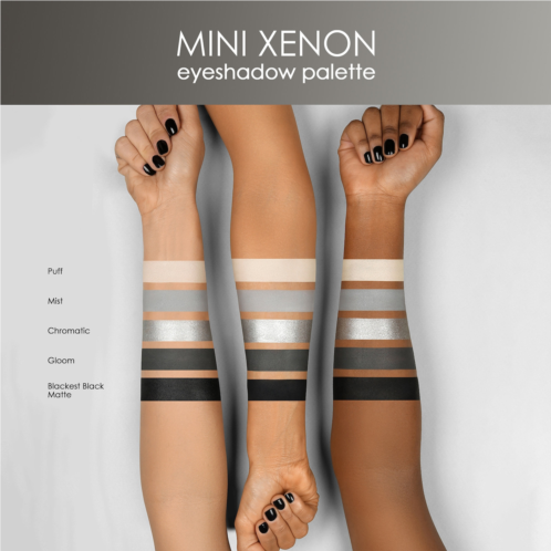 - 5 x 0.028 oz/ 0.8 g Eyeshadows in Blackest Black (deep black), Gloom (medium dark grey), Chromatic (platinum silver), Mist (light gray), Puff (off white)