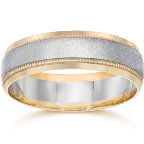 Two Tone ring has a satin White Gold center and Yellow Gold Milgrain edge. Ring has an approximate measure of 6mm in width and an approximate weight of 6 grams.