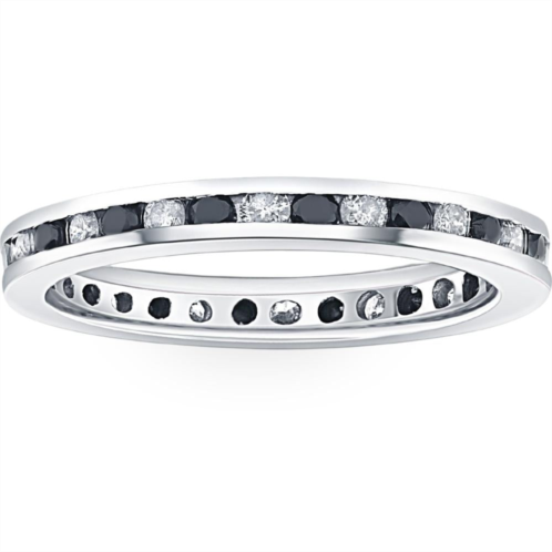 This classic womens eternity ring features alternating black and white diamonds. The black diamonds are color enhanced. All diamonds are channel set in solid 14k white gold. 1ct total diamond weight for all finger sizes.