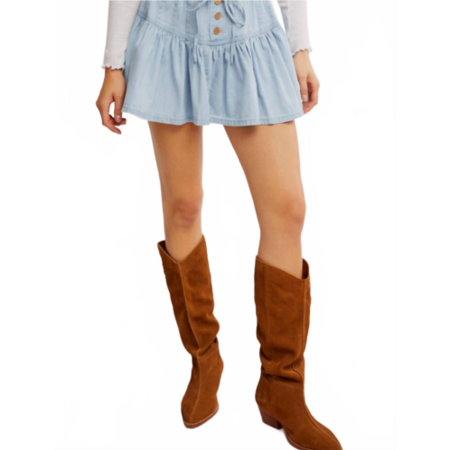 Tuck in your favorite tee for a more laid-back vibe.Step into style with the Roselle Denim Mini Skirt by Free People, your new favorite for any occasion. This mini skirt in a solid 'Going Steady' hue features an A-line silhouette and a high rise with a unique drawstring at the waist. Crafted from 100% cotton for breathability, it measures approximately 14.5 inches in length and is finished with an exposed button fly closure. Enjoy easy maintenance with simple machine wash care.
