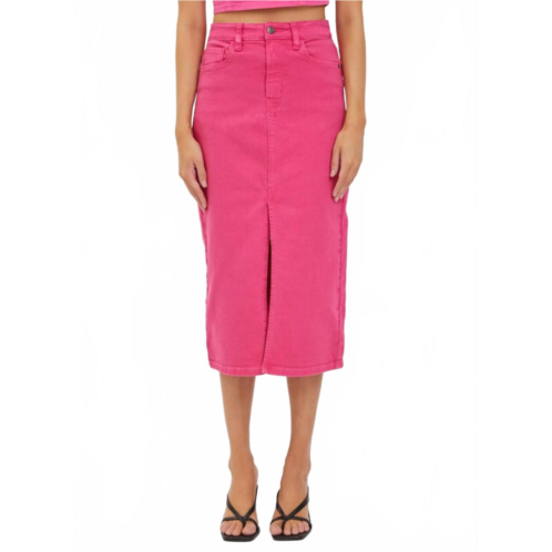 Show off just the right amount of skin in this beautifuly designed midi length skirt.Embrace effortless style with the Paylon Denim Midi Skirt by CELLO, crafted in a chic pink hue perfect for spring. Featuring a high-rise fit and a relaxed, comfortable silhouette, this skirt includes a playful front slit and four practical pockets. Material - 93% Cotton, 5% Polyester, 2% Spandex. Closure - Zip fly. Care - Machine wash, tumble dry. Length - C.F Length 30 1/2', C.B Length 31 1/2'. Available in sizes X-Small to Large, with a true-to-size fit.