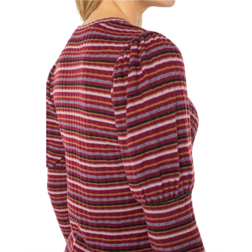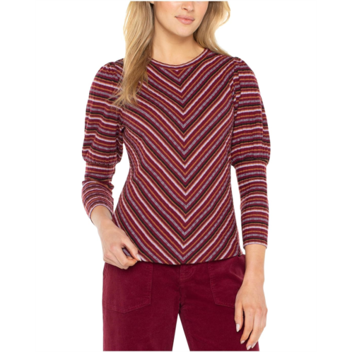 Step into effortless elegance with the Liverpool Los Angeles 3/4 Juliette Sleeve Crew Neck Knit Top W/ Miter, featuring a striking miter design. It features a crew neck, three-fourth puff sleeves, allover striped details, and a straight hem. This versatile piece combines classic style with modern flair, making it a must-have addition to your wardrobe.