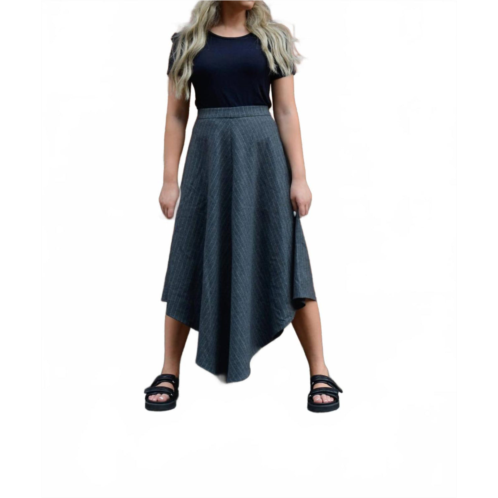 Feminine and stylish, this assymmetical skirt checks all of the boxes.Upgrade your winter style with the Ruby Asymmetrical Skirt by Esteem Couture, exuding timeless sophistication with a modern edge. Crafted from luxurious wool, this grey skirt features a classic pinstripe pattern, perfectly aligning with minimalist fall trends. Its asymmetrical design offers a unique, contemporary flair ideal for work, formal gatherings, or special occasions like Thanksgiving. Please note there are no pockets, closure type, or specific care instructions provided.