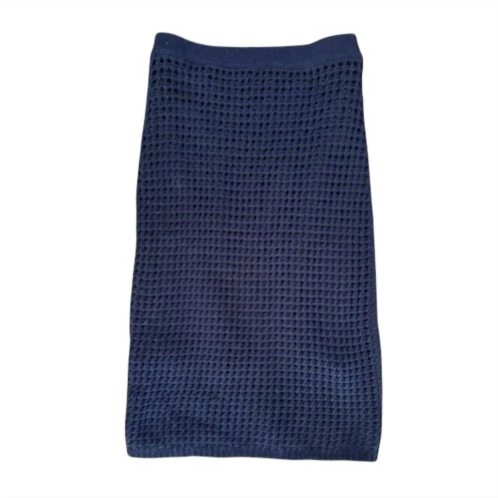 Tuck your favorite tee into this midi length skirt for an effortlessly cool look.Discover the Textured Crochet Skirt by Theory, a perfect blend of comfort and style for your travel adventures. This women's midi skirt comes in a rich navy blue and features a heavy-weight waffle knit fabric with a sateen lining for added elegance. Made of 100% cotton with a lining of 100% polyester, it offers a pull-on closure with a covered elastic waistband for ease and comfort. Measuring 25.25' in length, this skirt is imported from China and requires dry cleaning for maintenance. Size small fits a 14' waist with stretch capability.