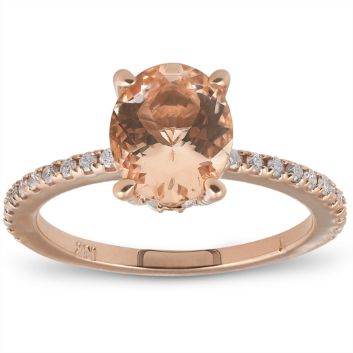 Womens ring features round cut genuine diamonds and 1.85ct 10x8mm oval genuine peach color morganite. All diamonds are set in solid 14k rose gold. Finger size 7.5 only.