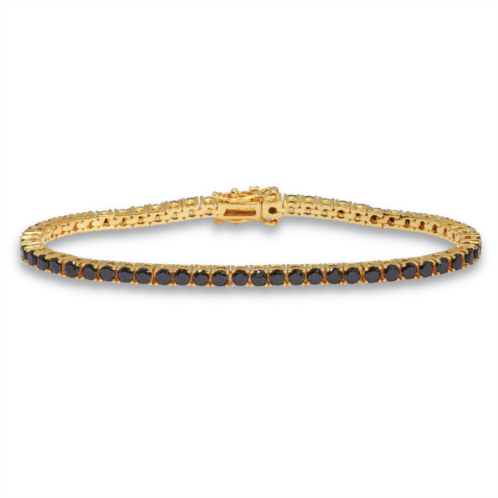 Add a bit of shine to any look with a sleek black tennis bracelet. 5.9 carats T.W. of round-cut cubic zirconia stones add an edgy twist to this classic design. Ideal for layering with other jewelry, yet eye-catching enough to wear on its own, this 14k yellow gold-plated bracelet is a versatile addition to your collection. 7 3/4 inch length with hidden box clasp.