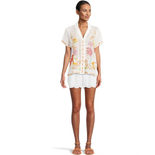 Offering understated sophistication, the Johnny Was Piper Applique Shirt is crafted from a soft fabrication. Featuring a button down front and short sleeves, this applique top is adorned with tropical floral bursts atop a vibrant color. It comes with collared neckline, allover embroidered detailing, and classic fit.