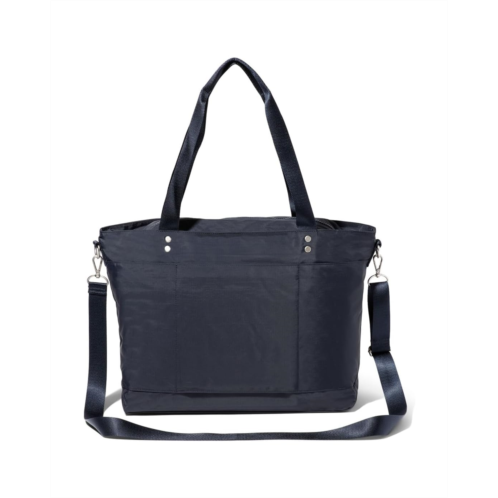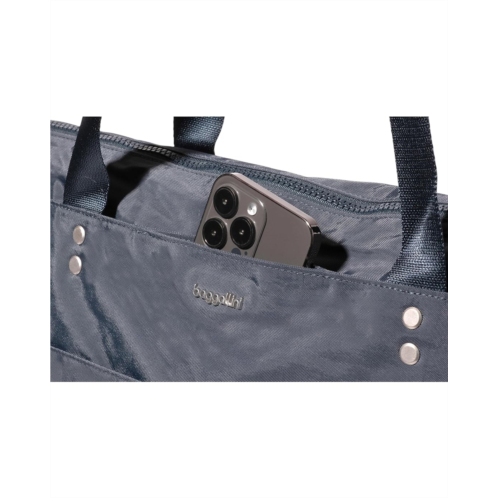 - With the ability to be worn as a shoulder bag or crossbody, this spacious Baggallini Carryall Laptop Tote is a must-have for your work week, upcoming travels, or trips. Store your computer in the secure 15' padded laptop sleeve. For smaller items that require fast access, exterior slip pockets and an anti-theft card wristlet have you covered. Constructed from durable nylon material, this versatile bag features a removable and adjustable crossbody strap, dual grab handles, and a zippered top closure.