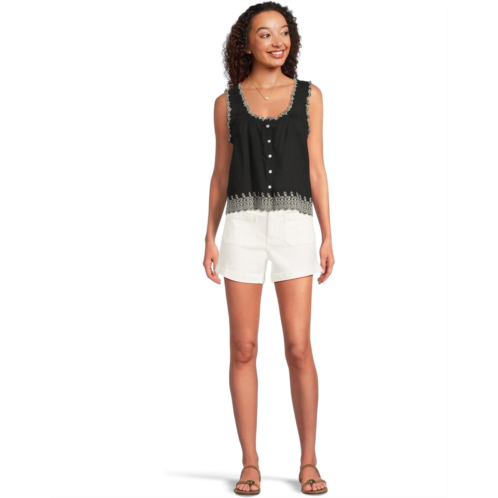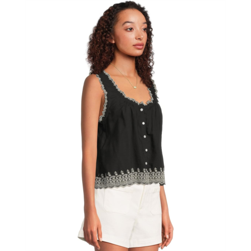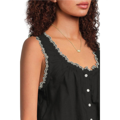 Designed for versatility, this Madewell Jenny Top - Cotton Viscose Voile top easily transition from desk to dinner. The pullover style features a crew neckline and a sleeveless silhouette with broad and scalloped trim-highlighting straps.