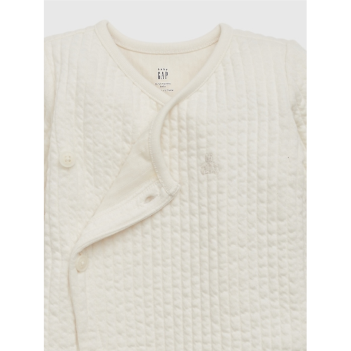 - Crossover snap button closure to go easy on little heads and belly buttons.