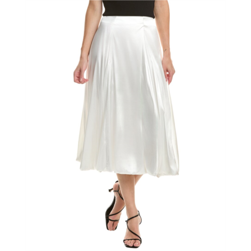 Introducing the '& Rouge Solid Midi Skirt' from our women's clothing collection. This elegant midi skirt in white features a ruched hem design detail and a center back zip for easy wear. Made from 100% polyester, this skirt is machine washable and imported. The length is approximately 31 inches from shoulder to hem, and the model is 5'9' and is wearing a size small. Please note that measurements may vary slightly by size. Perfect for any occasion, this skirt is a must-have addition to your wardrobe.