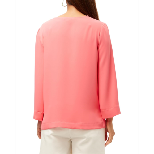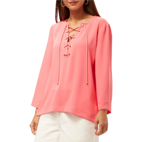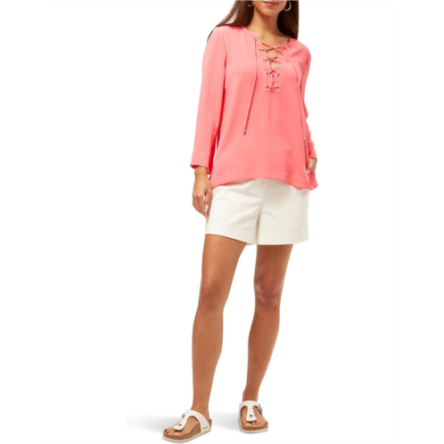 Stay cool, relaxed, and fashionable all day long wearing Trina Turk Catamaran Top. This relaxed-fit top features a flattering lace-up V-neckline, quarter length sleeves for a touch of elegance, and side slits that add a breezy, laid-back vibe. Pull-on ease ensures you can slip it on in seconds, while the versatile design pairs effortlessly with anything from jeans to skirts.