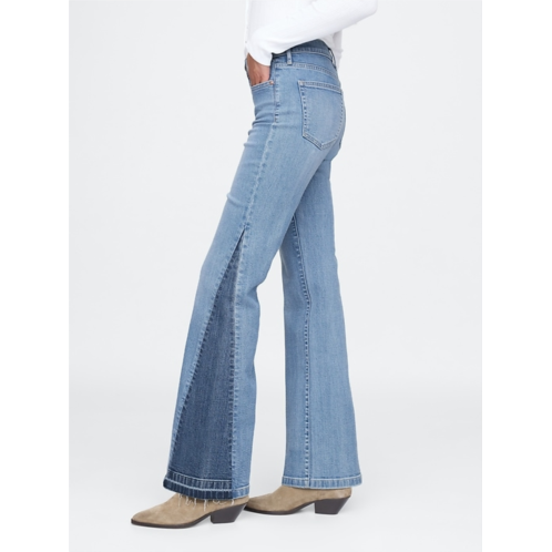-Look:A classic five-pocket jean in a medium indigo wash with patched denim at flare.