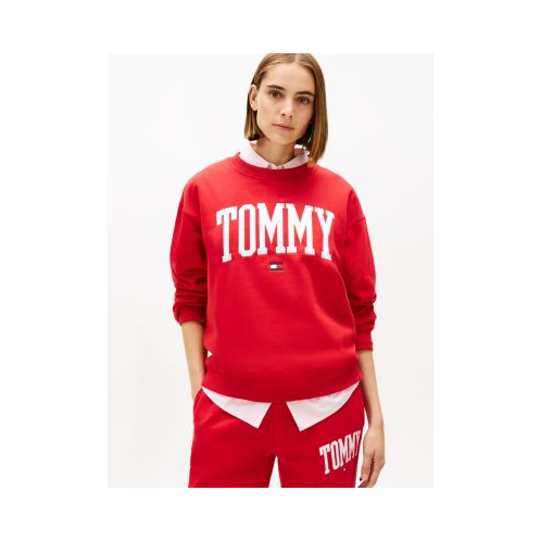 Tommy Hilfiger women's sweatshirt. Made from soft, brushed-back fleece with a smooth feel, this classic crewneck sweatshirt is designed with dropped shoulders and a varsity-inspired Tommy logo.