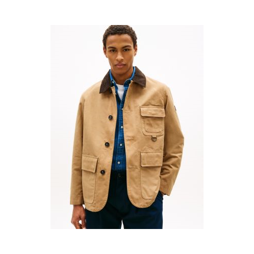 Tommy Hilfiger men's jacket. Inspired by the workwear staple, our cotton canvas barn jacket has it all roomy flap pockets, a corduroy collar and a durable, waxed finish. Cut in a relaxed fit, it easily slips over winter layers and provides protection from the elements.