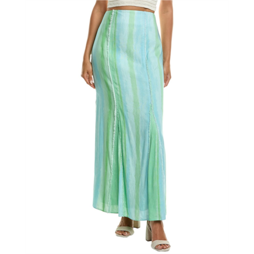 Introducing the Significant Other Aleksandra Midi Skirt in Green Mirage, a chic and versatile piece for your wardrobe. This high-waisted skirt features frayed seam details and an invisible back zip for a sleek finish. Made from a blend of 55% Linen and 45% Viscose Rayon, this skirt is both stylish and comfortable. Approximately 40.1 inches from shoulder to hem, this skirt is ideal for various occasions. Pair it with a blouse for a polished look, or dress it down with a casual top. Warm iron inside out and dry clean only. Imported. Elevate your fashion game with the Significant Other Aleksandra Midi Skirt.