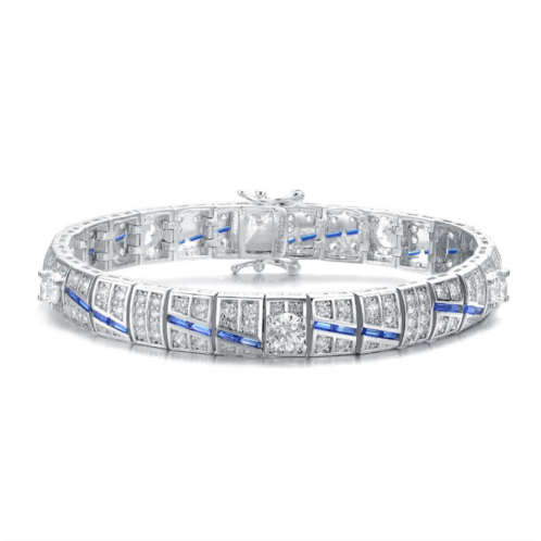 Elegant Sterling Silver Link Bracelet. This bracelet features connected links decorated with clear round and green baguette Cubic Zirconia stones. Crafted of Sterling Silver with White Gold Plating, and it is secured with a box clasp. This bracelet is also available with sapphire blue cubic zirconia.Measurement 7 inches