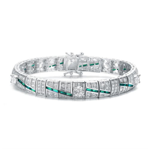 [US] Genevive sterling silver white gold plating with clear & green cubic zirconia link bracelet