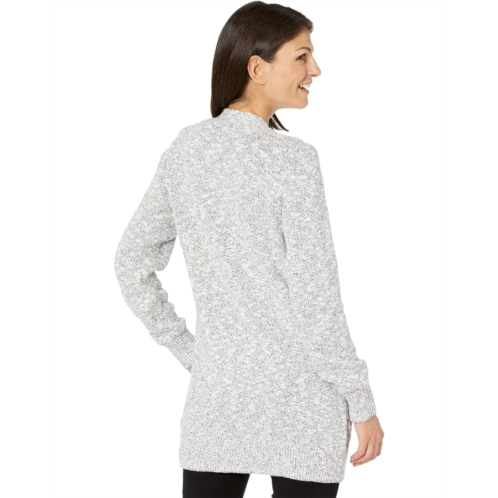 - Longline sweater features full-length sleeves, front patch pockets, and ribbed trim at cuffs and hem.