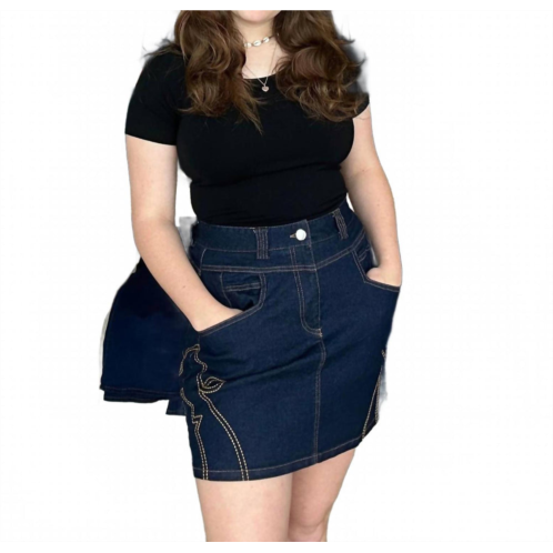 Tuck in your favorite tee for a more laid-back vibe.Presenting the Stretched Denim Cow Girl Skirt by SHE + SKY, a must-have for your Western-inspired wardrobe. This mini skirt in dark denim features a stylish and textured pattern, perfect for adding flair to any summer outing or holiday party like Thanksgiving. Designed with convenience in mind, it comes with pockets and a secure button closure. Ideal for women who value both style and durability, this versatile piece promises comfort on every adventure.