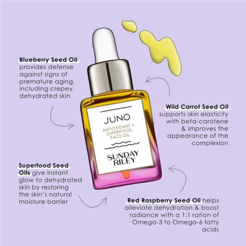 \'I have very dry skin, so Juno is something that I personally use every morning. I mix a little Juno into my sunscreen for easier application. I've also been known to mix a few drops of Juno with some foundation, which helps keep my skin fresh and radiant throughout the day. Without the Juno, foundation has a tendency to dry my skin out.\'?Sunday Riley