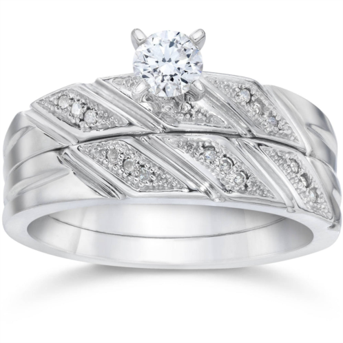 This ring set features a matching mens and ladies diamond ring. The engagement ring has a 1/6ct center stone. The diamonds are set in solid 10k white gold.