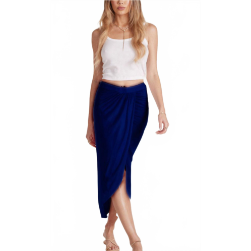 The midi length skirt is here to stay and we especially love this style.The Women's Draped Midi Skirt by bobi offers a chic and comfortable solution for your summer wardrobe, crafted from 100% soft cotton in a supreme jersey that feels lightweight and breathable. Designed for versatility, it features a draped slit and a stretch waistband, making it perfect for any occasion from poolside lounging to evening outings. This solid navy blue skirt effortlessly enhances a minimalist trend with its pull-on closure and vacation-ready style.