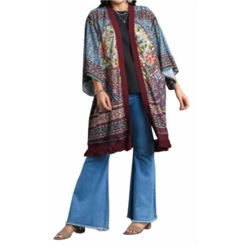 A comfy-all-day coverup that works just as good at dinner as it does by the pool.Open Floral Front Print Kimono. Long Sleeves. Loose Relaxed Fit. Fringe Hem Detail. Not Lined. True To Size. 100% Polyester.