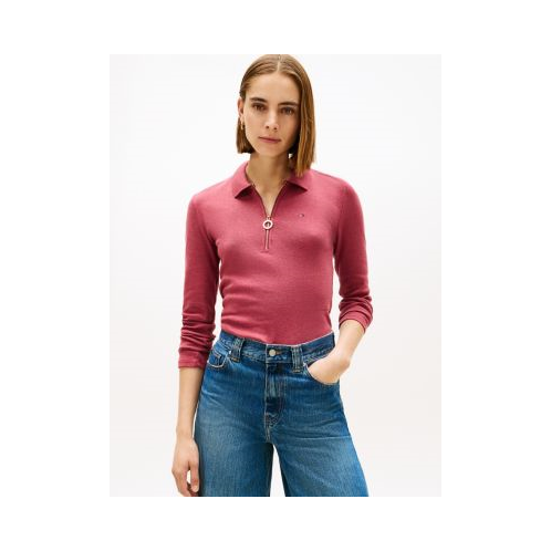 Tommy Hilfiger women's polo. Designed in a trim fit from premium cotton, this long-sleeve polo has an elevated feel, thanks to the gold-tone zip placket.