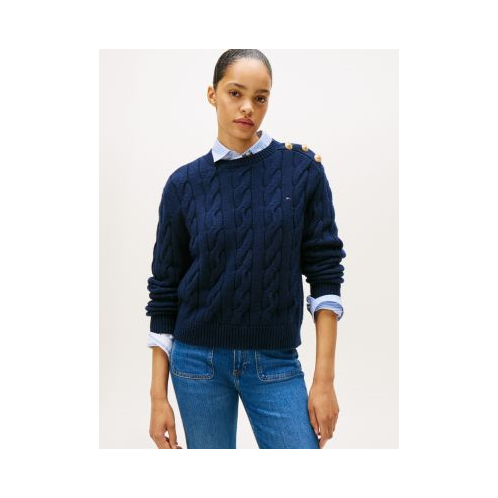Tommy Hilfiger women's sweater. The preppy cable knit texture and polished gold-tone buttons lend an elevated feel to this soft cotton sweater.