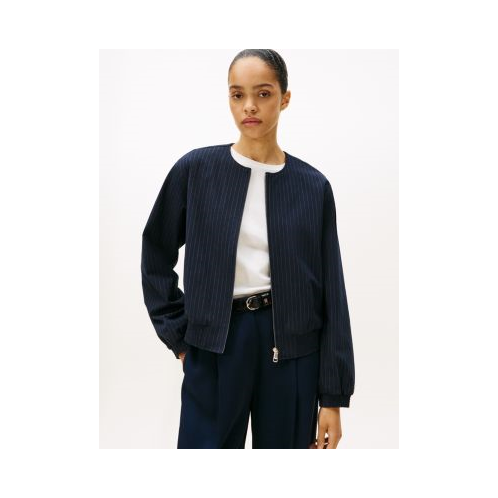 Tommy Hilfiger women's jacket. Our flattering bomber is made from a stretchy, midweight blend with a soft, smooth feel. This versatile piece features side welt pockets, a shirred hem and a collarless neckline for a clean finish.
