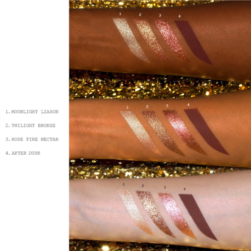 - 4 x 0.0425 oz/ 1.3g eyeshadows in Moonlight Liaison (gleaming gold champagne), Rose Fire Nectar (coral-rose duochrome sparkle), After Dusk (mahogany-brown matte), Twilight Bronze (platinum-bronze shimmer)