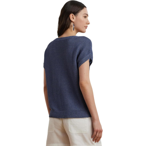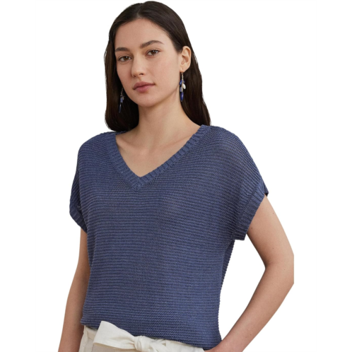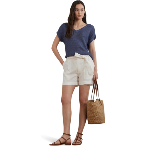 Cut for a relaxed-fitting silhouette that slightly tapers at the hip, the Lauren Ralph Lauren Linen-Blend Short-Sleeve V-Neck Sweater's short-sleeve design and lightweight linen-blend fabrication make it a perfect piece for transitional dressing. Intended to hit at the hip, this pullover sweater is styled with a ribbed V-neckline, short Dolman sleeves with ribbed cuffs, and a rack-stitched hem. Stay comfy and stylish wearing this V-neck sweater.