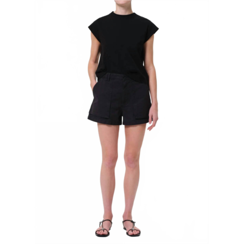 Tuck your favorite tee into these high-waist shorts for a more casual-cool feel.The Kiva Mid Rise Cargo Short by PISTOLA is a summer essential, perfect for vacations and breezy outings. Featuring a mid-rise fit with a slight A-line silhouette, these shorts are crafted from 100% regenerative cotton twill, ensuring durability and comfort. Made in the USA, they incorporate thoughtful design elements like double belt loops, patch pockets, and a zipper fly closure. With a 12 3/4' rise and a 3' inseam, they provide a flattering fit, and the washed-out black offers a vintage 90s aesthetic. Care instructions - machine wash cold inside out with like colors, and tumble dry low. Model is 5'10' and wears a size 27.