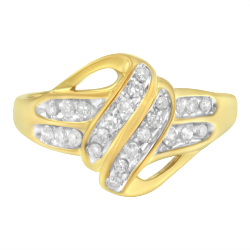 This gorgeous floral style statement ring is crafted in 10 karat yellow gold flashed 92.5% sterling silver. Natural, earth-mined diamonds cut into rounds are set in a seven stone flower shaped cluster at the heart of the ring. A frame of petite round diamonds are set into a halo matching the shape of the center. The slightly domed band is set with three rows of diamonds. This striking ring can serve as an engagement ring, wedding ring, anniversary gift, or fashion statement. This ring is perfect for any occasion. It’s a classic and femenine piece she’ll want to show off every day. Give her a present that will become a favorite jewelry staple.