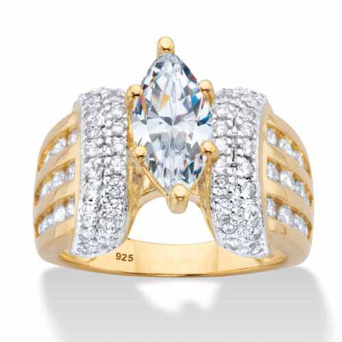 Show off your shoulders! This undeniably exquisite contemporary engagement ring showcases a large marquise-cut cubic zirconia flanked by glittering cz wrapped shoulders and three rows in a dramatic wide band style. It's the one you've been waiting for. 3.14 carats T.W. 18k gold-plated sterling silver. Sizes 7-10.